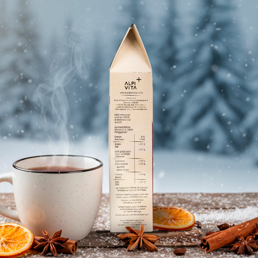 Ingredienti: bucce d’arancia, rosa canina, cannella, coriandolo, chiodi di garofalo, anice stellato, bacche di ginepro.